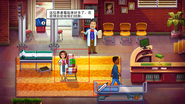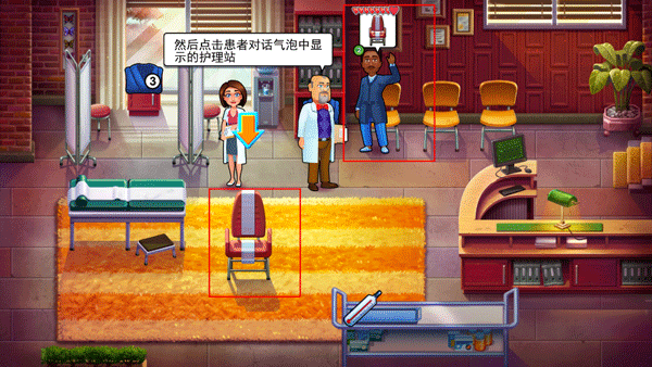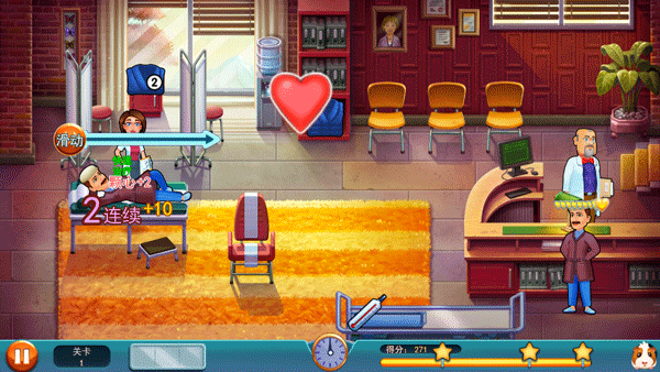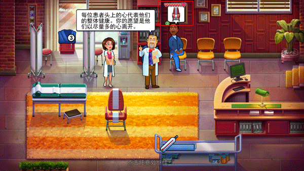 4. 首關較為簡單:患者頭頂?shù)摹靶摹贝砥浣】禒顟B(tài),目標是讓他們以盡可能多的心數(shù)康復離院;同時,頭上會明確顯示待辦事項。