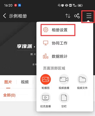 2)點擊右上角“更多設(shè)置”圖標,選擇【相冊設(shè)置】